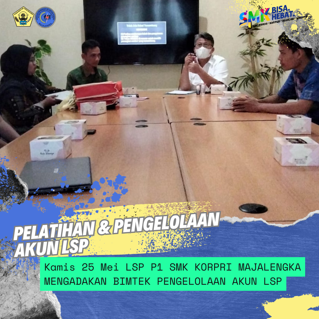 Kamis, 25 Mei 2023. Badan Nasional Sertifikasi Profesi (BNSP) melakukan kegiatan pelatihan pengelolaan akun Lembaga Sertifikasi Profesi (LSP) pada sistem informasi BNSP. Dimana BNSP menunjuk LSP P1 SMK KORPRI Majalengka sebgai tuan rumah pelaksana. Kegiatan ini dilaksanakan di Ruang Rapat A SMK KORPRI Majalengka. Tujuan BNSP melaksanakan kegiatan ini untuk peningkatan pelayanan sistem infomasi BNSP. Dalam kegiatan ini dipandu langsung oleh pihak BNSP dalam materinya menjelaskan mengenai tahap-tahap untuk pengisian sistem informasi BNSP terutama untuk LSP yang baru mendapatkan lisesnsi.